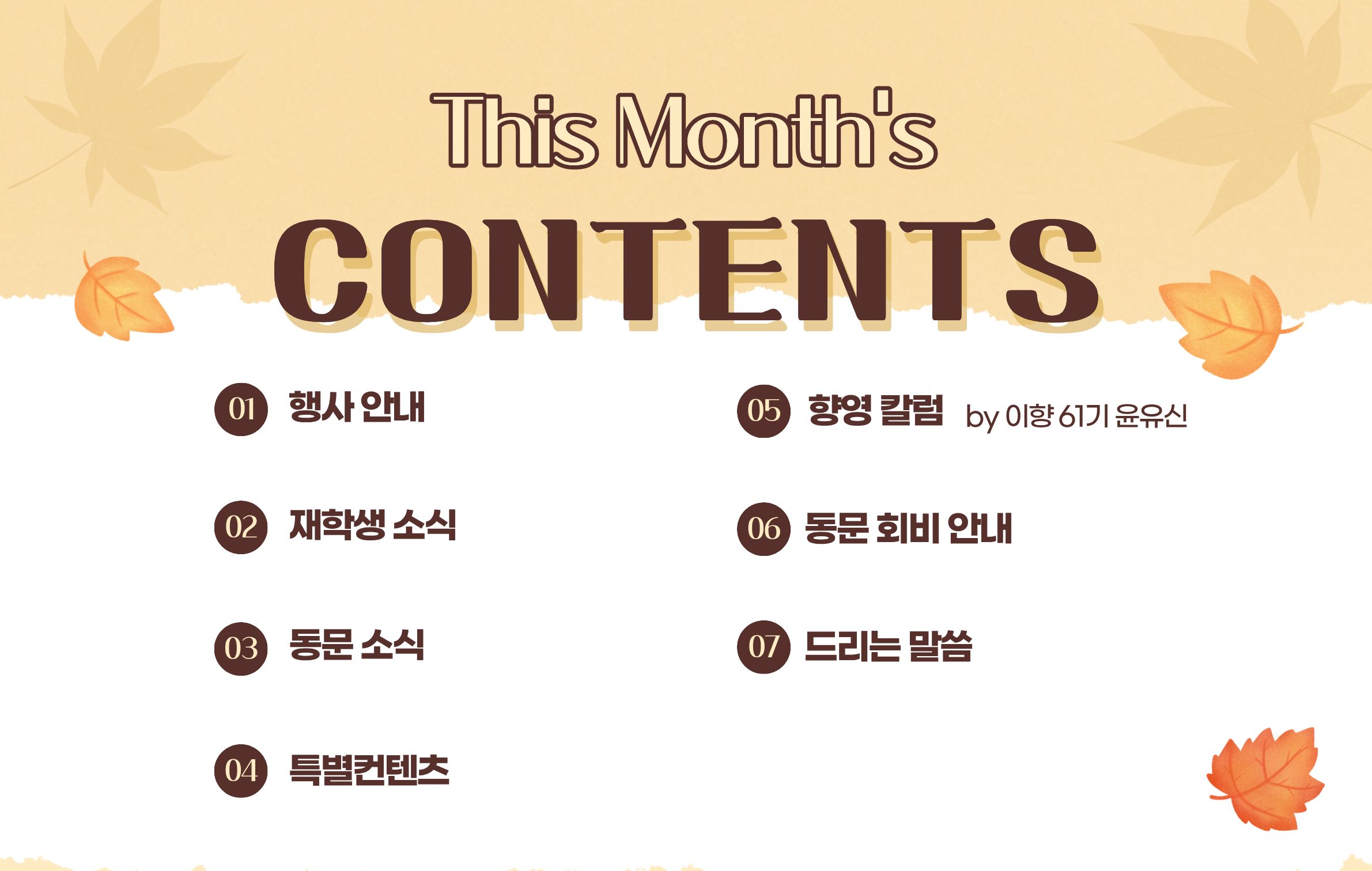 새로운 학기를 맞이한 향영인들도 가을의 문턱에서 잠시 숨을 고르며 새로운 계절을 준비하고 있습니다. 개강의 설렘과 정신없는 일상 속에서 향영의 소식을 차곡차곡 담아왔습니다. 뜨거웠던 여름을 지나 선선한 가을을 맞이하는 지금, 또다시 새로운 걸음을 내딛는 향영인들의 이야기가 이번 호에도 가득 담겨 있습니다. 9월의 월간향영과 함께 더 풍성한 계절을 시작해 보시길 바랍니다.