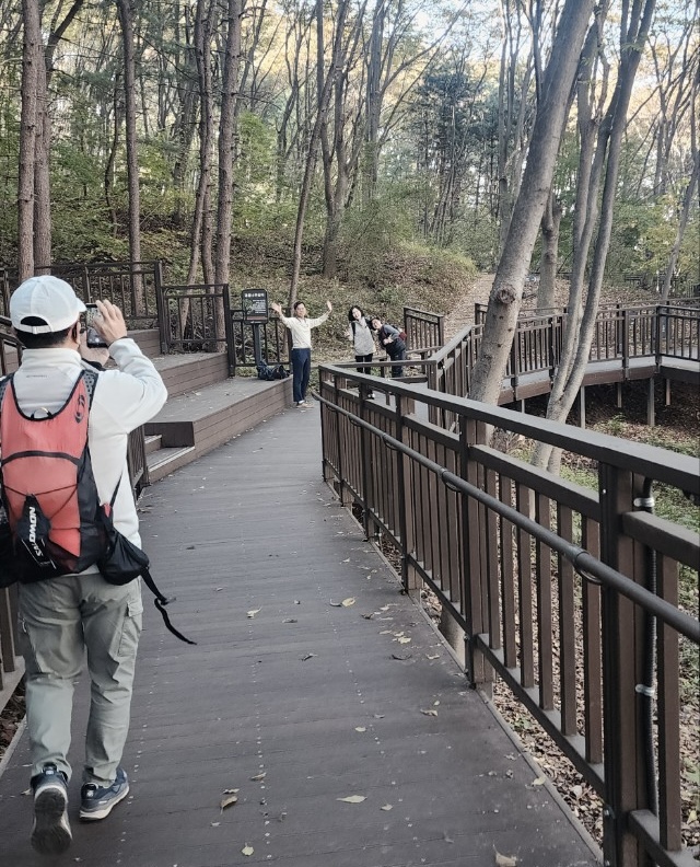 아침 10시, 남부터미널역 4번 출구 앞에는 다양한 기수의 선배님들이 모이셨습니다. 완전한 등산 복장으로 준비하신 분부터 편안한 차림으로 오신 분까지, 복장은 제각각이었지만 얼굴에는 모두 설렘이 묻어 있었습니다. 하늘은 잠시 흐렸으나, 출발과 함께 구름이 걷히며 맑은 햇살이 비추기 시작했습니다. 향산지애 고려향영 21기 서경민 회장님께서는 코스 안내와 함께 포토 포인트와 주요 지점을 설명해 주셨습니다. 코스는 남부터미널역에서 시작하여 우면산 무장애숲길을 지나 대성사, 억새원, 성심약수터, 서울둘레길 10코스 종료지점으로 이어지는 약 5km 구간이었습니다.